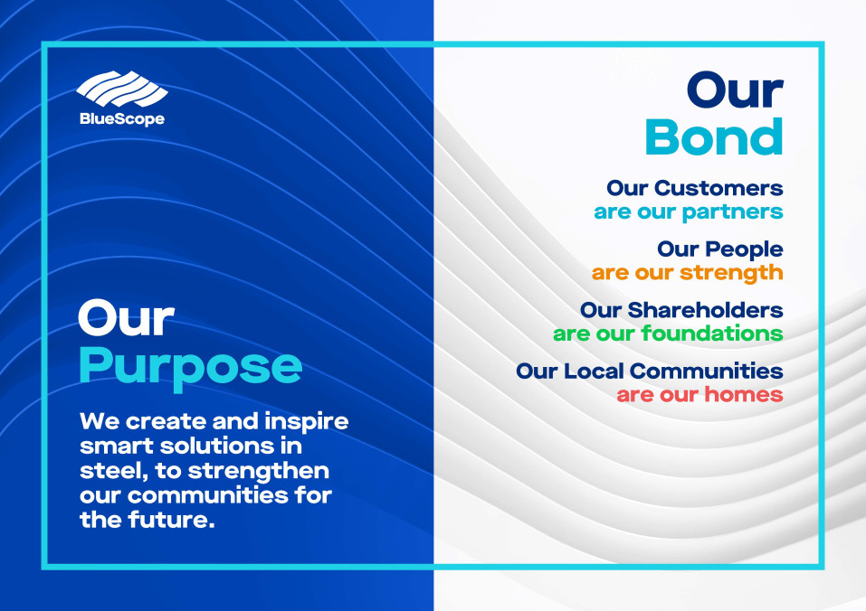 Together, Our Purpose, Bond and Strategy define the way BlueScope develops, manufactures and sells steel products and solutions, while building our own resilience and capacity to drive a sustainable future.